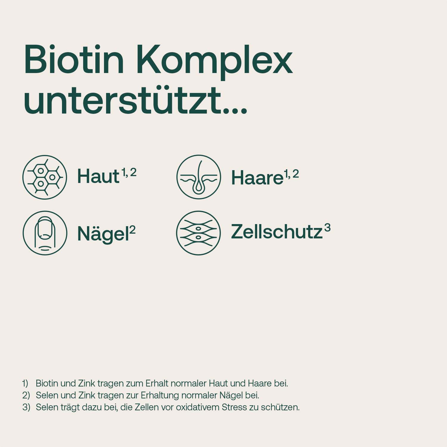 Aber der Biotinkomplex hilft euch nicht ausschliesslich dabei: Seine Inhaltsstoffe haben zahlreiche weitere Aufgaben im Organismus – zum Beispiel unterstützen sie den Energiestoffwechsel und die normale Funktion des Immunsystems. Zink und Selen tragen ausserdem zum Schutz der Zellen vor oxidativem Stress bei, während Biotin zusätzlich den Erhalt einer normalen Nervenfunktion unterstützt. So leistet der Biotinkomplex nicht nur äusserlich, sondern auch innerlich wertvolle Dienste – Tag für Tag. Und auch bei den Zutaten bleibt alles clean und klar: Wir setzen auf ballaststoffreiche Akazienfaser als einzigen Füllstoff und verzichten bewusst auf unnötige Zusätze.
