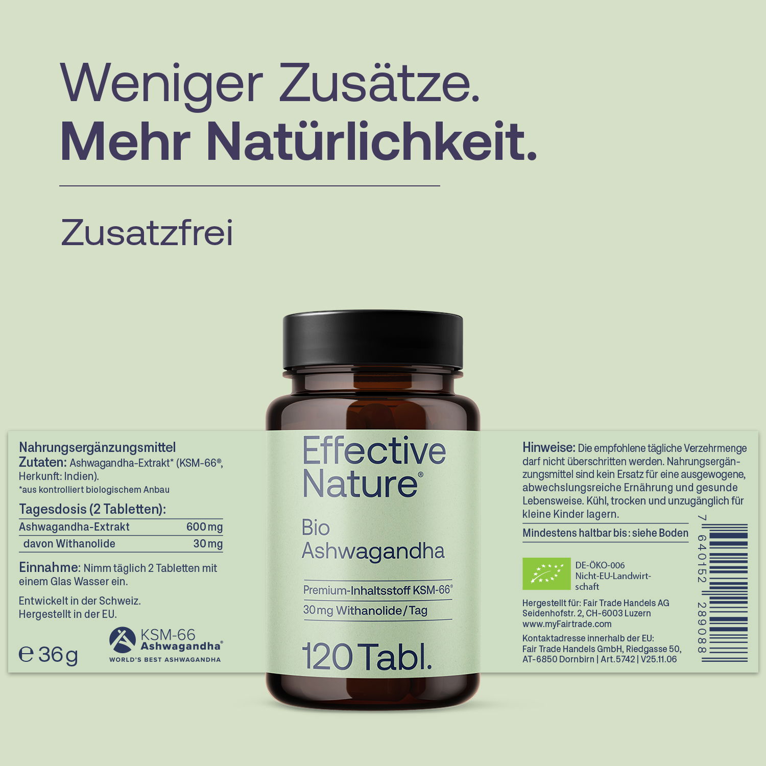 Der Ashwagandha Extrakt mit KSM-66 Ashwagandha® von effective nature ist vegan, rein natürlich und kommt ohne Zusatzstoffe aus. Die empfohlene Tagesdosis liefert 600 mg Ashwaganda Extrakt, wovon 30 mg wertvolle Withanolide sind. Ein weiterer Pluspunkt: Der Ashwagandha Extrakt KSM-66 schmeckt angenehm neutral.
