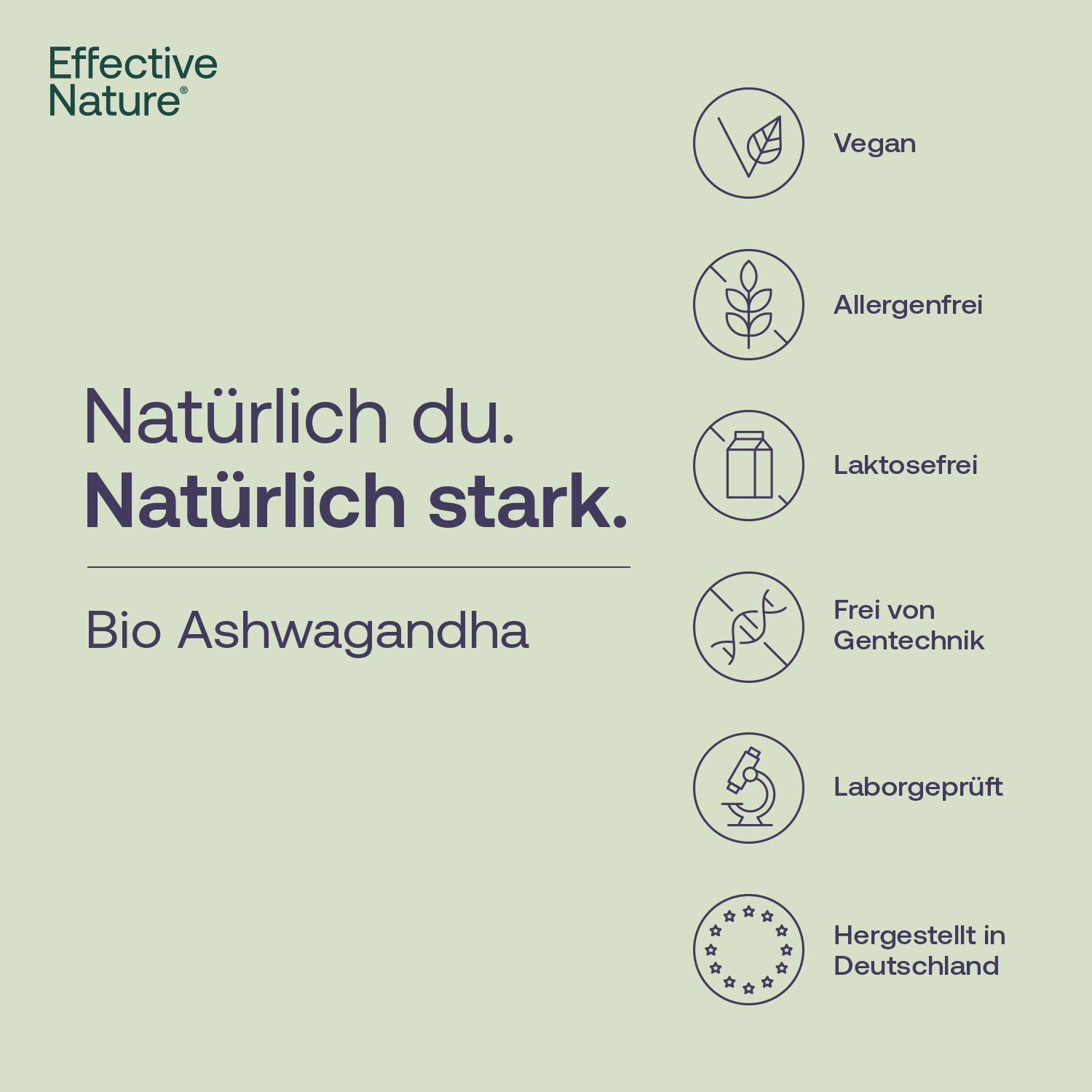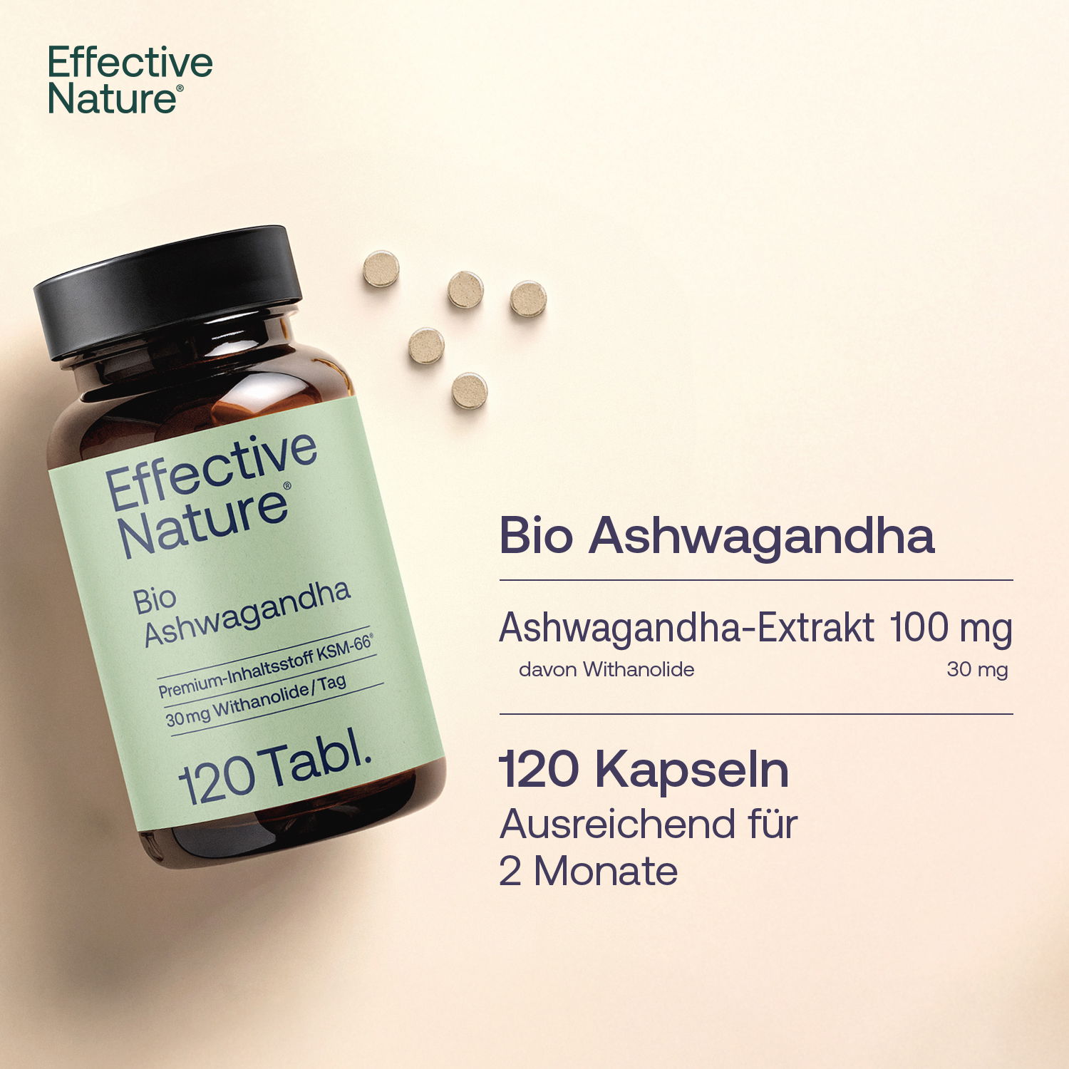 Ashwagandha, auch bekannt unter weiteren Namen wie Schlafbeere, Indischer Ginseng oder Winterkirsche, ist eine beliebte Pflanze aus der ayurvedischen Tradition - sie wird seit Jahrtausenden in Indien angepflanzt und genutzt. Heute wird sie wegen ihren wertvollen, adaptogenen Eigenschaften weltweit geschätzt und verwendet. effective nature verarbeitet den speziell hochwertigen Bio-Extrakt KSM-66 Ashwagandha®, der in Indien - Heimat des Ayurvedas - traditionell aus der Ashwagandha Wurzel hergestellt wird. Er enthält alle einzigartigen sekundären Pflanzenstoffe, insbesondere auch die sog. Withanolide. Ebendiese sind durch ihren Zusammenhang mit den adaptogenen Eigenschaften der Ashwagandha Pflanze bekannt: Sie sollen der ayurvedischen Schlafbeere u.a. eine beruhigende und entspannende Wirkung verleihen - daher rührt auch die deutsche Namensgebung.