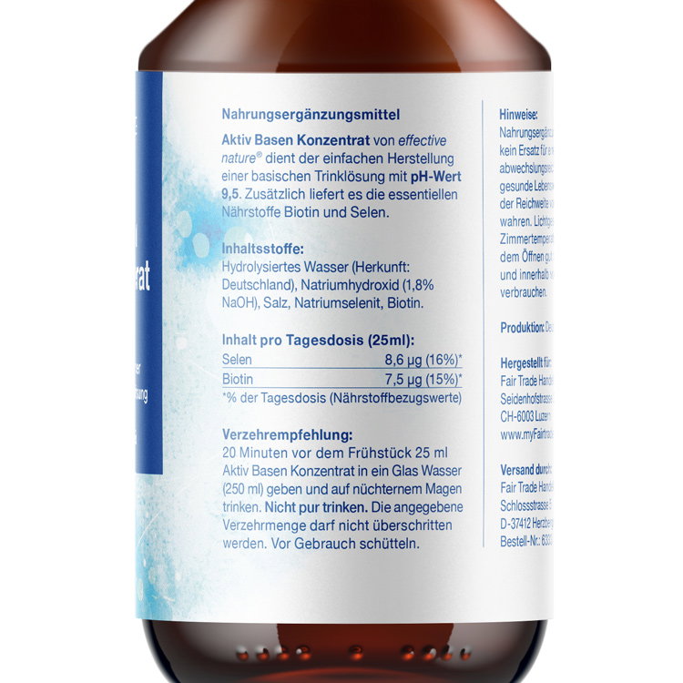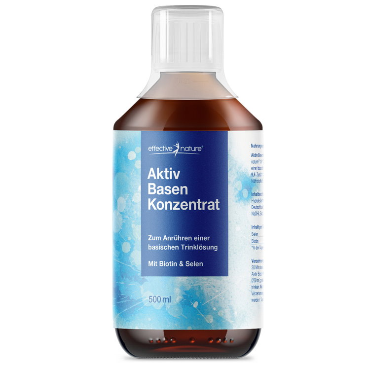 Neu von effective nature: Aktiv Basen Konzentrat zum Anrühren einer basischen Trinklösung mit einem hohen, basischen pH-Wert von 9,5. Basische Trinklösungen können sowohl regelmässig - bei einer basischen oder basenüberschüssigen Lebensweise - als auch im Rahmen spezieller Basen- oder Entschlackungskuren als wichtige begleitende Massnahme eingenommen werden. Anders als Aktiv Basen Plus von effective nature ist dieses hochbasische Konzentrat jedoch noch nicht trinkfertig. Das heisst, es muss vor dem Verzehr mit Wasser gemischt werden, da sein sehr hoher basischer pH-Wert die pure Einnahme nicht zulässt. Dank mitgeliefertem Messbecher gelingt die Herstellung Ihrer basischen Trinklösung allerdings problemlos und einfach. Bei der empfohlenen Dosierung erhalten Sie so die gewünschte Lösung von pH 9,5 - und das Aktiv Basen Konzentrat hält für knapp 3 Wochen.