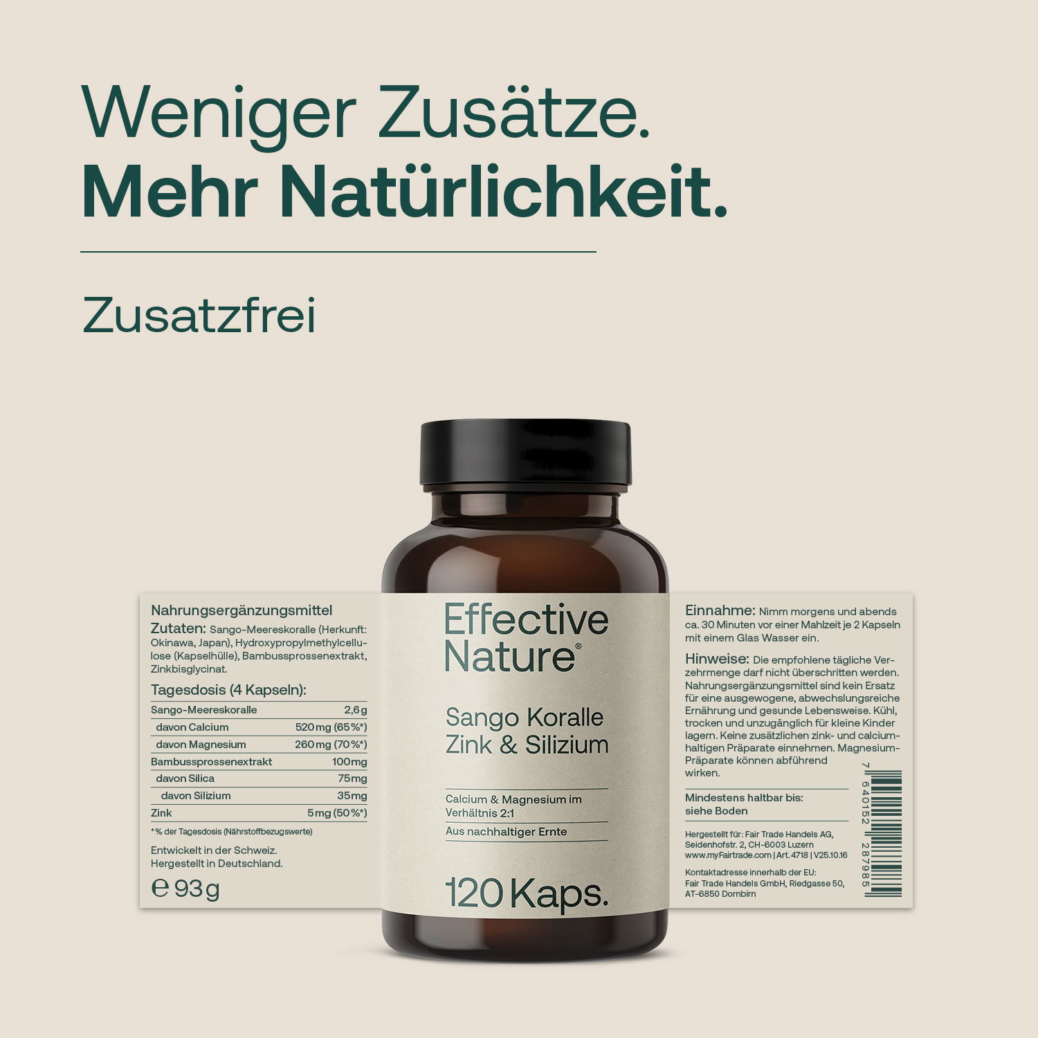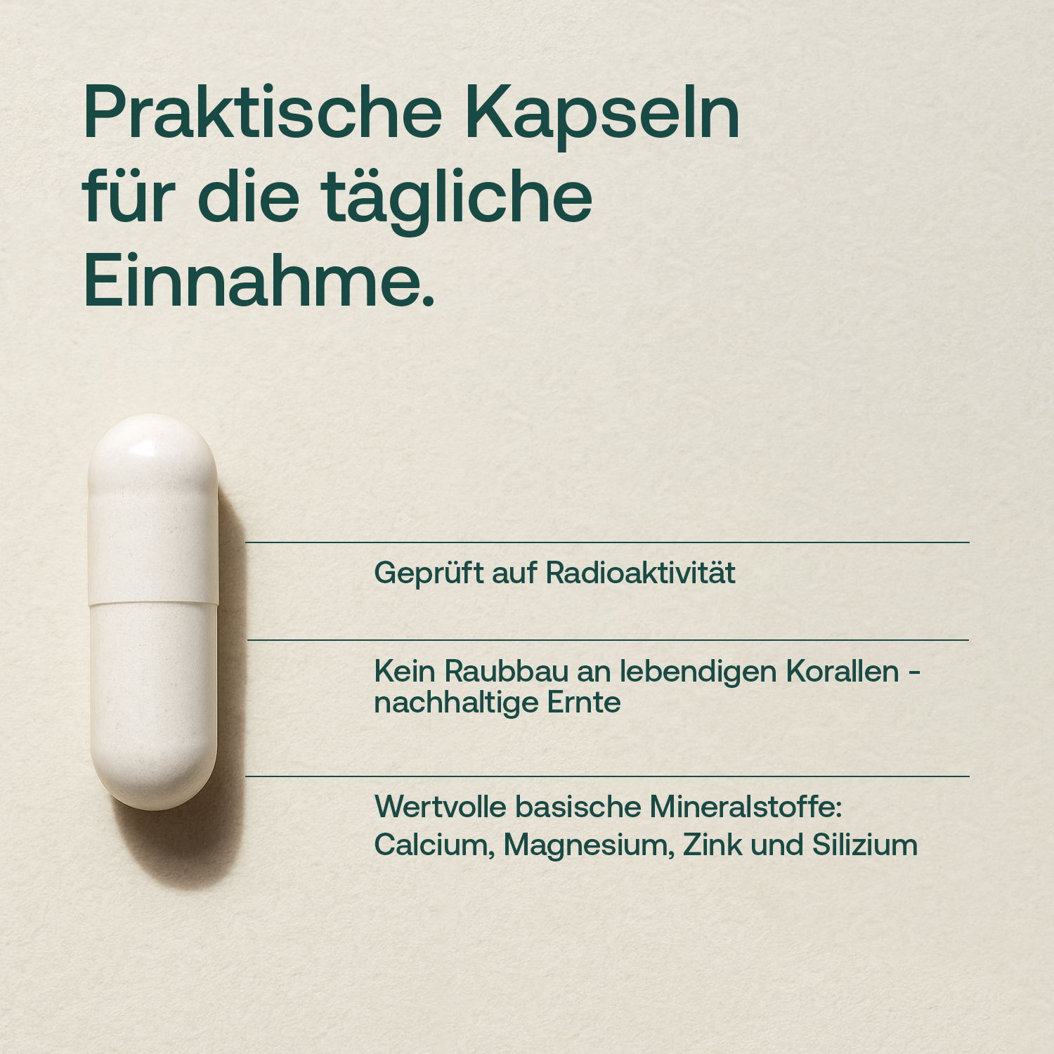 Mit der empfohlenen Tagesdosis von 4 Kapseln nehmen Sie knapp 80 Prozent der empfohlenen Tagesdosis an Calcium sowie 70 Prozent der empfohlenen Magnesium-Tagesdosis und 50 Prozent der empfohlenen Zinkdosis sowie 35 mg Silizium aus Bambus-Extrakt auf. Die Ummantelung der Kapseln besteht aus einem rein pflanzlichen Material, wodurch sie sich auch für Veganer und Vegetarier eignet. Um die beste Qualität zu garantieren, wird die Sango-Meereskoralle in diesen Kapseln regelmässig auf Radioaktivität und andere Verunreinigungen geprüft. Sie können sicher sein, mit diesem Produkt nur hochwertigste Qualität in den Händen zu halten.