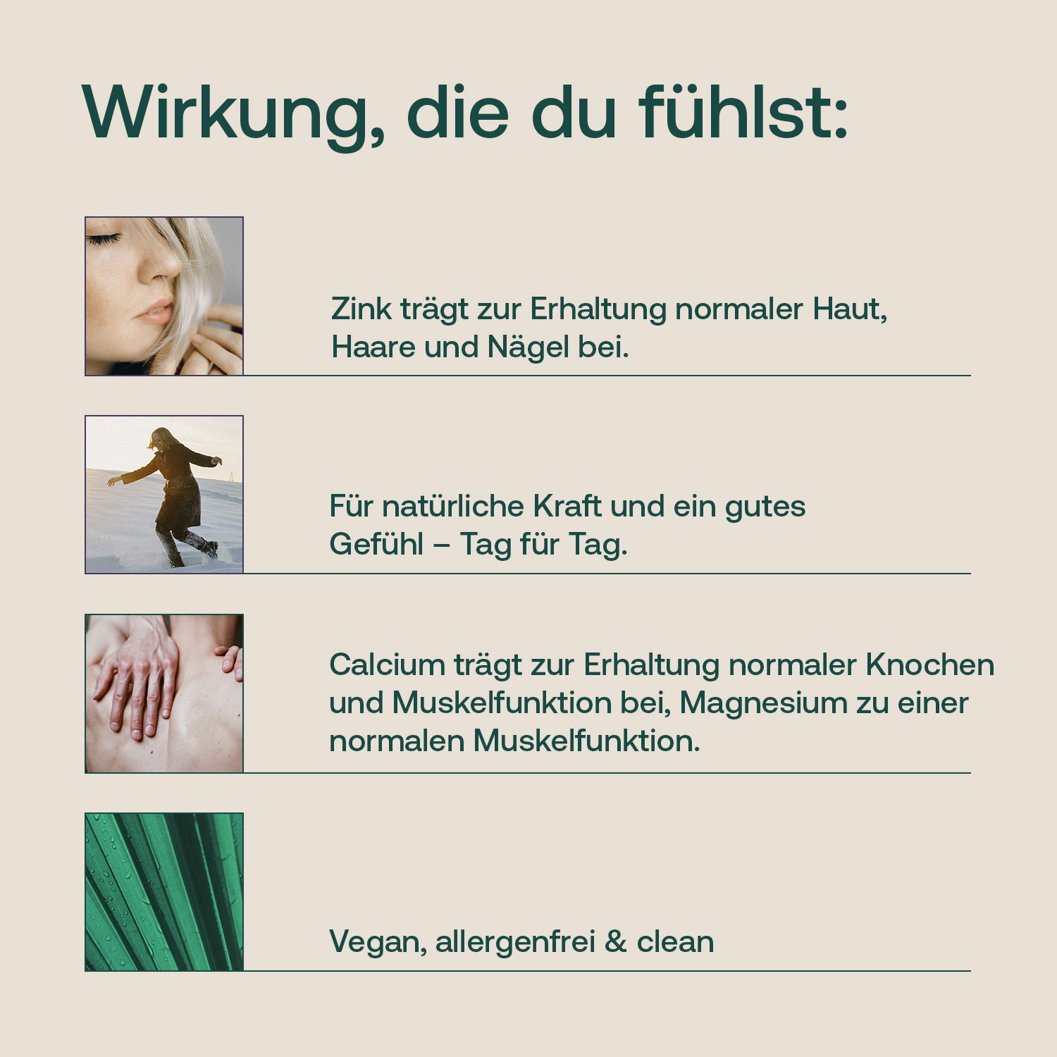 Calcium., Magnesium, Zink und Silizium: Zusammen tragen diese Substanzen auf drei unterschiedlichen Wegen zu Ihrem innerlichen und äusserlichen Wohlbefinden bei.
