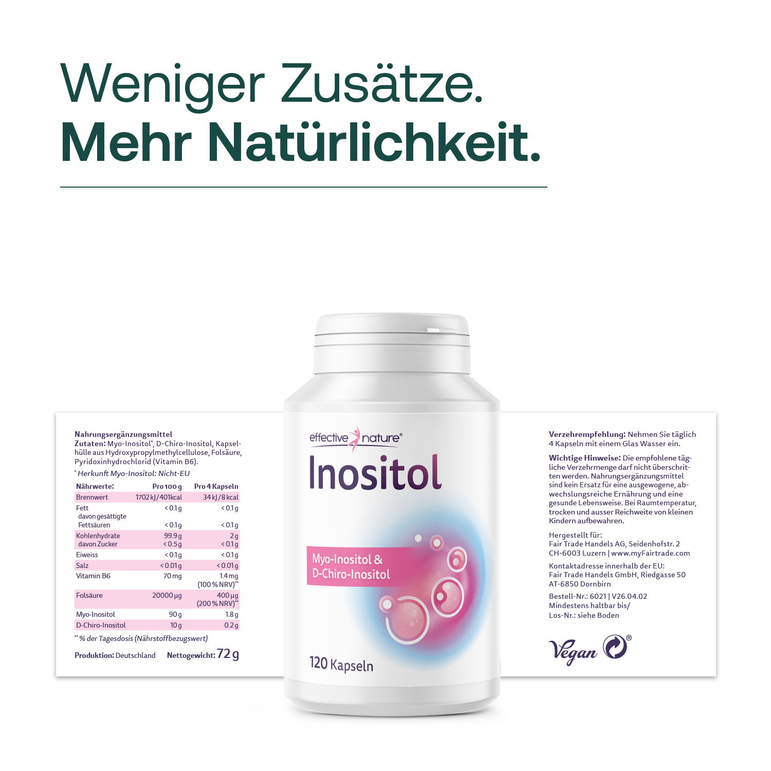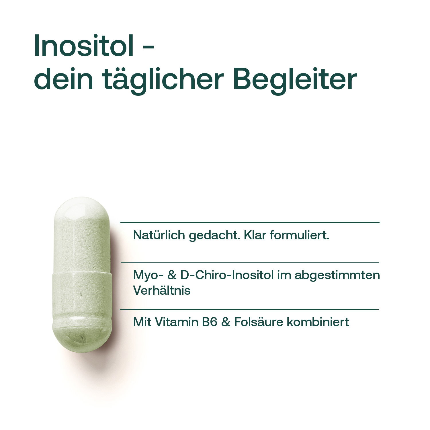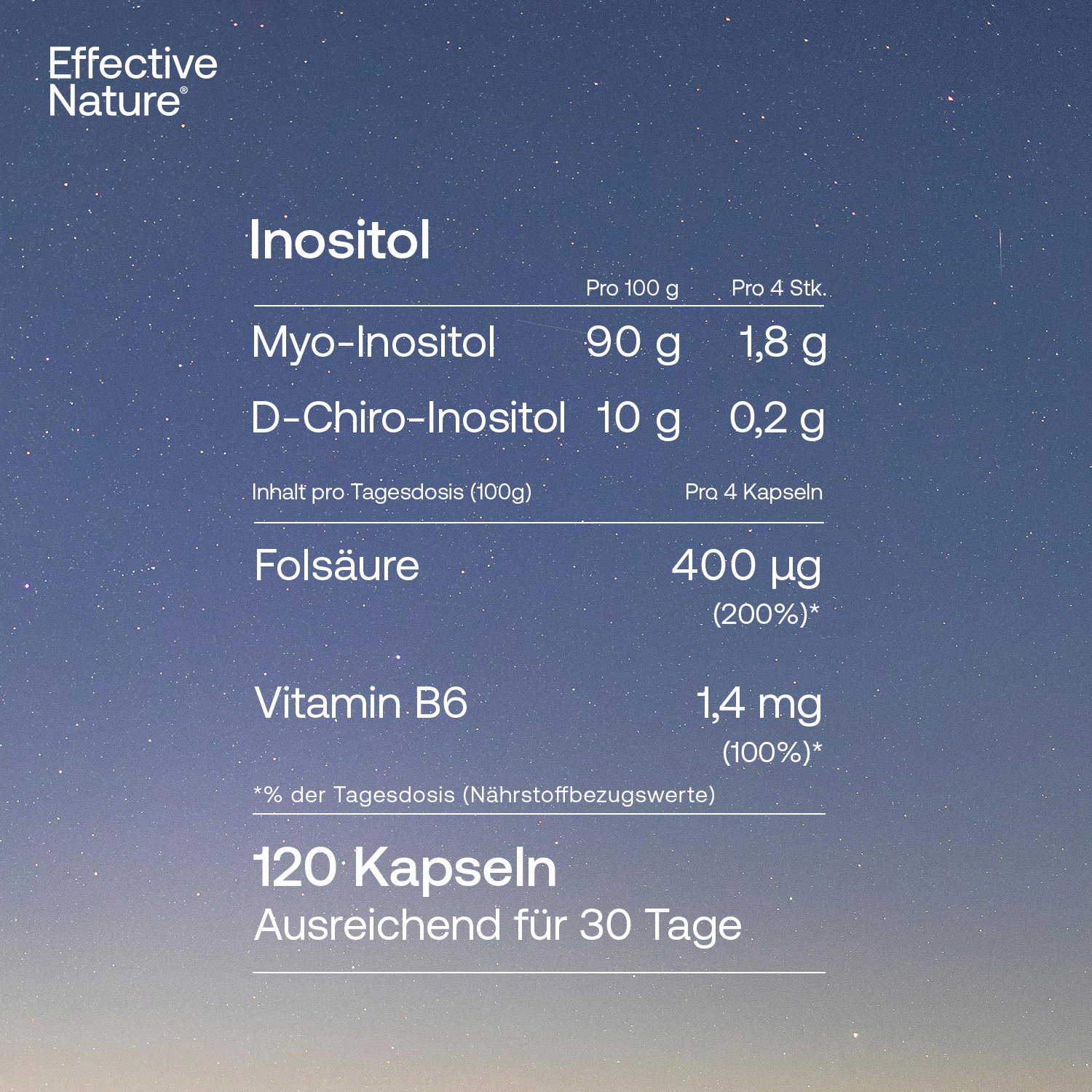 Inositol ist ein besonderer Botenstoff aus der Natur, der auch in geringen Massen vom Menschen selbst produziert wird. Bei den beiden Hauptinhaltsstoffen der Inositol Kapseln handelt es sich um Myo-Inositol und D-Chiro-Inositol, die u.a. im Hormonstoffwechsel eine Rolle spielen. Es ist die optimierte Mischung der zwei Inositol-Formen, die die Kapseln von effective nature so hervorstechen lassen. Zusätzlich enthalten sind Folsäure (Vitamin B9) und Vitamin B6 - die perfekten Begleiter bei PCOS! Die Inositol-Kapseln sind die ideale Wahl für Frauen, die ungern Tabletten zu sich nehmen und auch unterwegs eine praktische Lösung favorisieren.