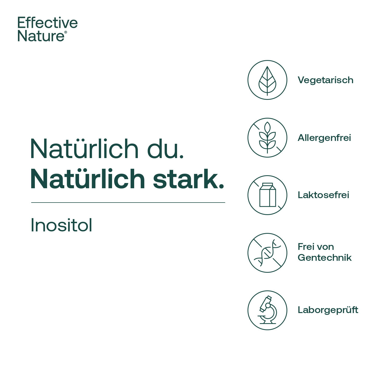 Nehmen Sie einmal am Tag 4 Inositol-Kapseln von effective nature mit einem grossen Glas Wasser ein. Das Inositol von effective nature gibt es auch als Inositol Pulver und Inositol Tabletten
