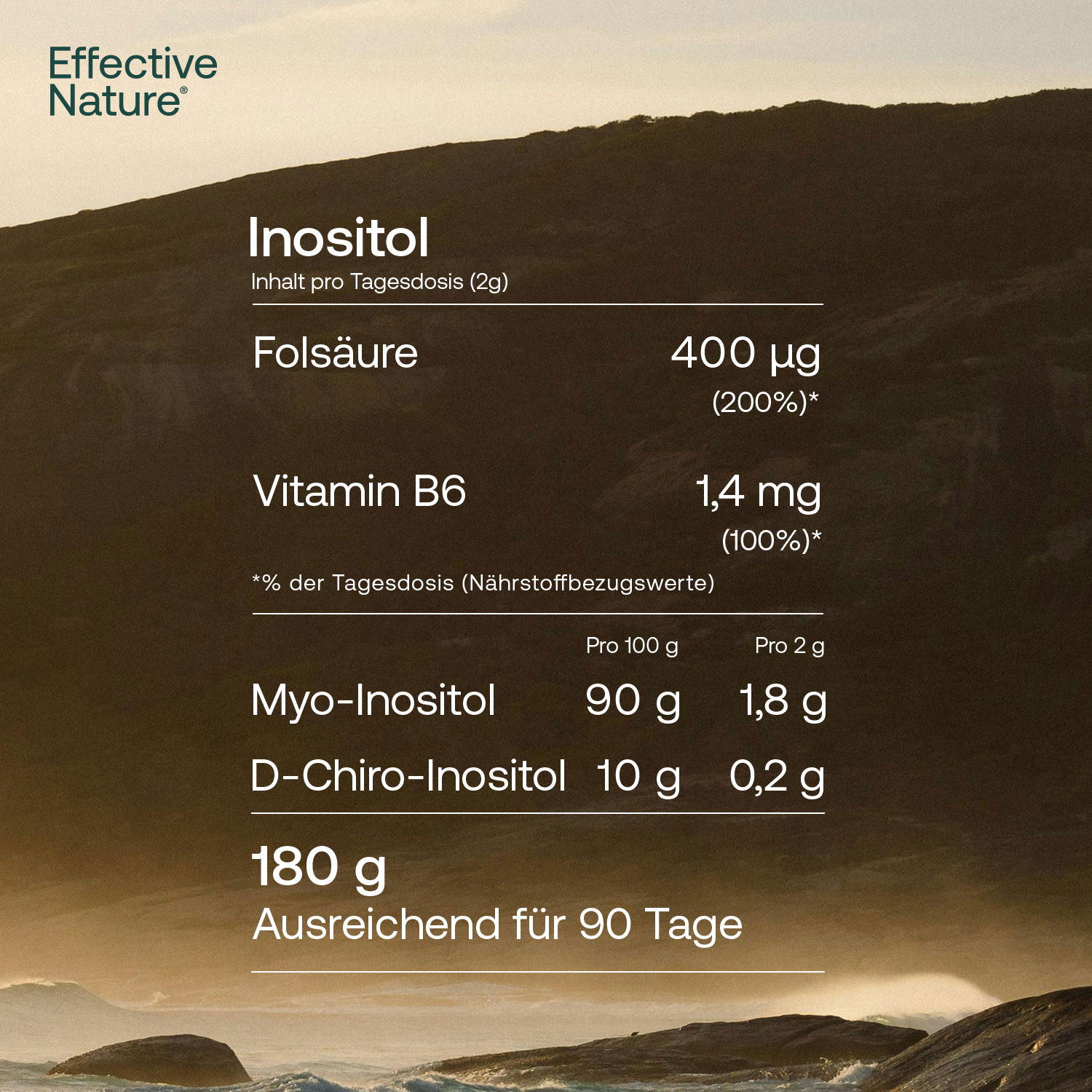 Inositol von effective nature dient der Behandlung von Zyklusunregelmässigkeiten, die auf Grund des sogenannten PCO-Syndroms auftreten. Zwei spezielle Formen des Inositols (Myo- und D-Chiro-Inositol) sind wichtige Botenstoffe, die unter anderem im Hormonstoffwechsel eine wichtige Rolle spielen. Mittlerweile ergaben viele Studien einen positiven Effekt auf die Beschwerden des PCO-Syndroms (zu denen neben Zyklusunregelmässigkeiten viele weitere Symptome zählen, wie Übergewicht, Haarausfall, erhöhter Androgenspiegel etc.), weshalb Inositol vermehrt zur Behandlung von PCOS (d.h.: polyzystisches Ovarsyndrom) eingesetzt wird.
