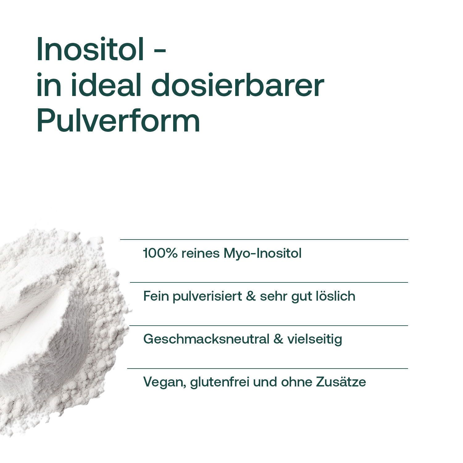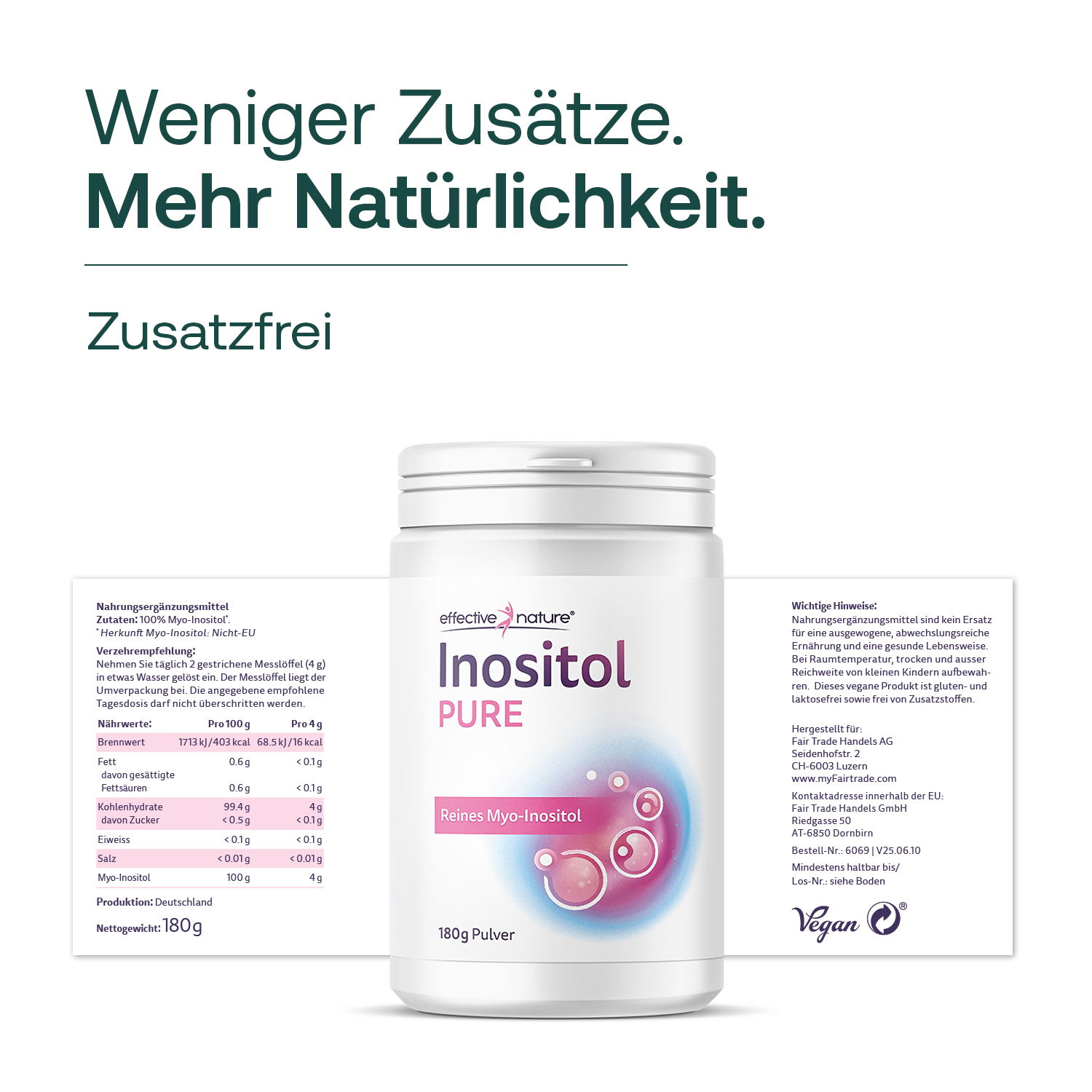 Myo-Inositol gehört zur Familie der inositolhaltigen Verbindungen und ist ein natürlicher Bestandteil vieler pflanzlicher und tierischer Lebensmittel. Es ist besonders bekannt für seine Rolle im Zellstoffwechsel und wird vielseitig eingesetzt. Unser Myo-Inositol Pur ist hochrein, geschmacksneutral und lässt sich ideal in Wasser, Smoothies oder andere Getränke einrühren. Es ist frei von Zusatzstoffen, vegan und einfach in den Alltag zu integrieren. Die feine Pulverform sorgt für eine besonders gute Löslichkeit und eine unkomplizierte Anwendung.