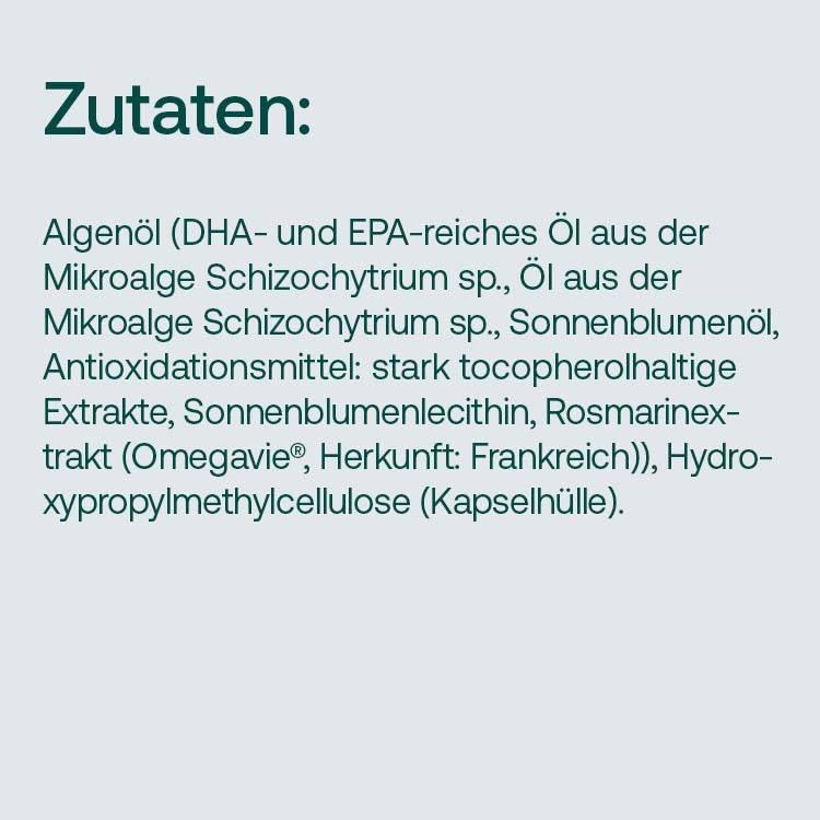 Antwort vom 09.03.2026Algenöl (DHA- und EPA-reiches Öl aus Schizochytrium sp. (Herkunft: Europa)), Kapselhülle aus Hydroxypropylmethylcellulose (Überzugsmittel), Antioxidationsmittel: Rosmarinextrakt, gemischte Tocopherole aus Sonnenblumenöl.