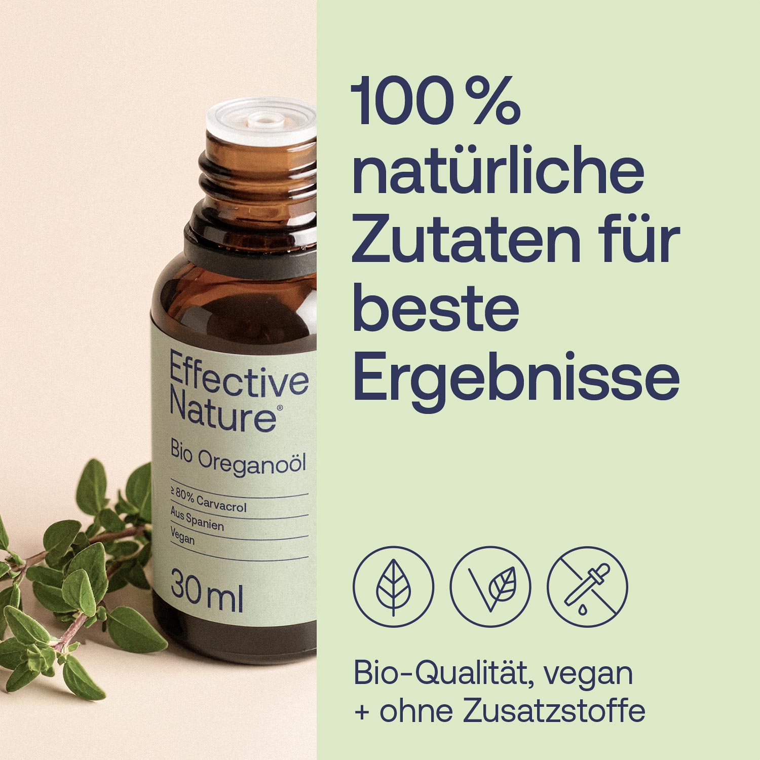 Entdecken Sie jetzt die neuen, noch höher konzentrierten Oreganoöl-Tropfen von effective nature in Bio-Qualität und überzeugen Sie sich selber vom intensiven Aroma dieses wertvollen Öls sowie dem aussergewöhnlich hochkonzentrierten Gehalt an der besonderen, pflanzentypischen Substanz Carvarcrol, die im flüssigen Oreganoöl von effective nature zu 80% enthalten ist - und auf diese Weise sogar den Carvarcol-Gehalt der Oreganoöl-Kapseln übertrifft! Das Öl wird in einem schonenden Verfahren per Wasserdampfdestillation gewonnen und zeichnet sich durch seinen würzig-herben Geschmack aus.