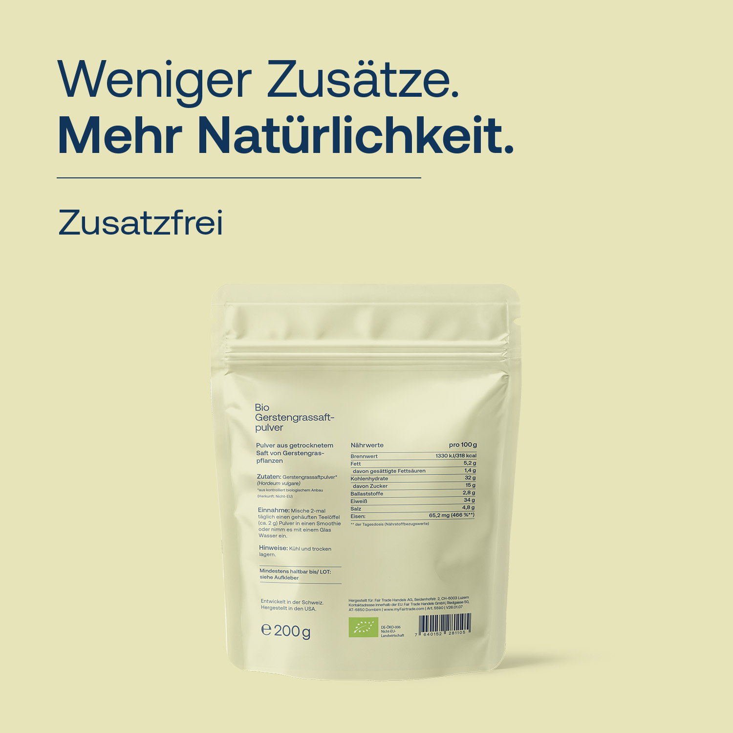 Die Änderung betrifft nur die Art der Deklaration auf der Verpackung/Produktseite, nicht aber die Zusammensetzung des Gerstengrasssaft-Pulvers selbst.
