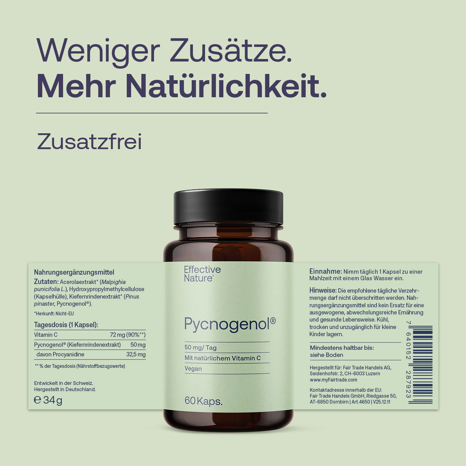 In jeder Kapsel finden sich 50 mg Pycnogenol®. Weitere Zusatzstoffe wie Aromen oder Konservierungsmittel kommen natürlich nicht zum Einsatz. Das Material der Kapseln ist rein pflanzlich, wodurch sie sich auch für Veganer und Vegetarier eignen.