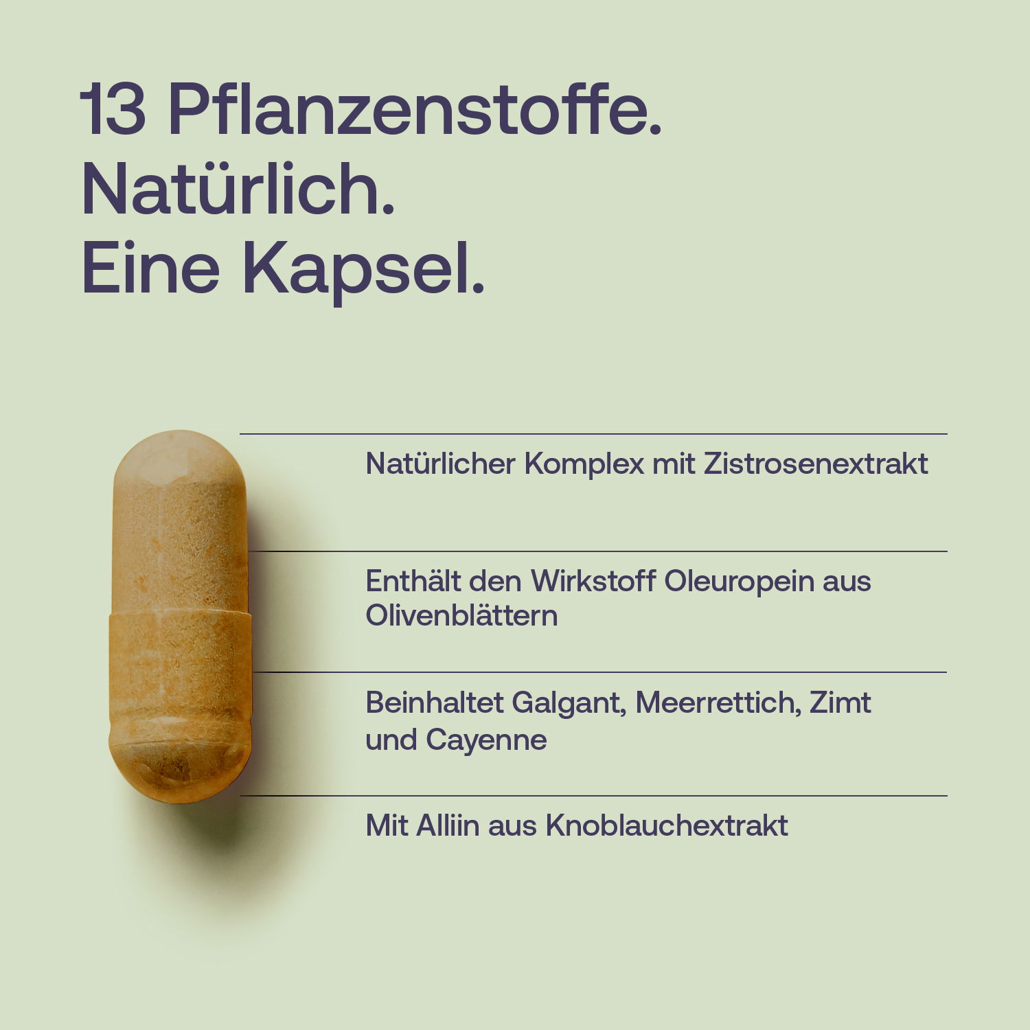 Antwort vom 14.11.2025Kapselhülle aus Hydroxypropylmethylcellulose (Überzugsmittel), Zistrosenextrakt, Knoblauchextrakt, Meerrettich, Galgant, Olivenblattextrakt, Kokosmehl, Zitronensaft, Oregano, Grapefruitkernextrakt, Kurkuma, Gewürznelken, Schwarzkümmel, Brunnenkresse, Zimt, Cayennepfeffer