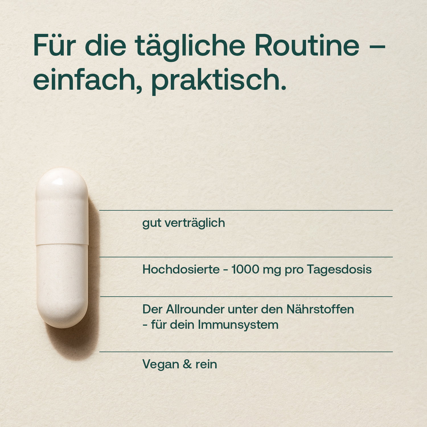 Pro Tagesdosis (2 Kapseln) liefert das Produkt 1220 mg Calcium-L-Ascorbat, entsprechend 1000 mg Vitamin C (1250 % NRV). Die Rezeptur ist bewusst klar gehalten: vegan, ohne unnötige Zusätze und auf das Wesentliche reduziert. Für eine sinnvolle Integration in den Alltag empfiehlt sich die Einnahme zu den Mahlzeiten.